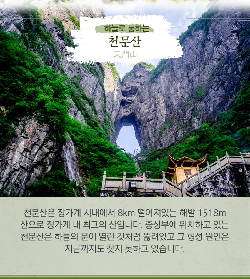 장가계의 산 중에서 역사에 가장 먼저 기록된 명산입니다. 천문산 정상까지 가려면 시내에서부터 이어진 세계 최장 길이의 7.45km 케이블카를 타고 올라가는데, 편도만 35분이 걸립니다. 천문산의 메인 '천문동'은 1,000m 높이의 절벽 위에 있으며, 천문동에서 아래를 내려다보면 999개의 가파른 계단과 99개의 구불구불한 고개가 시원하게 펼쳐져 있습니다.